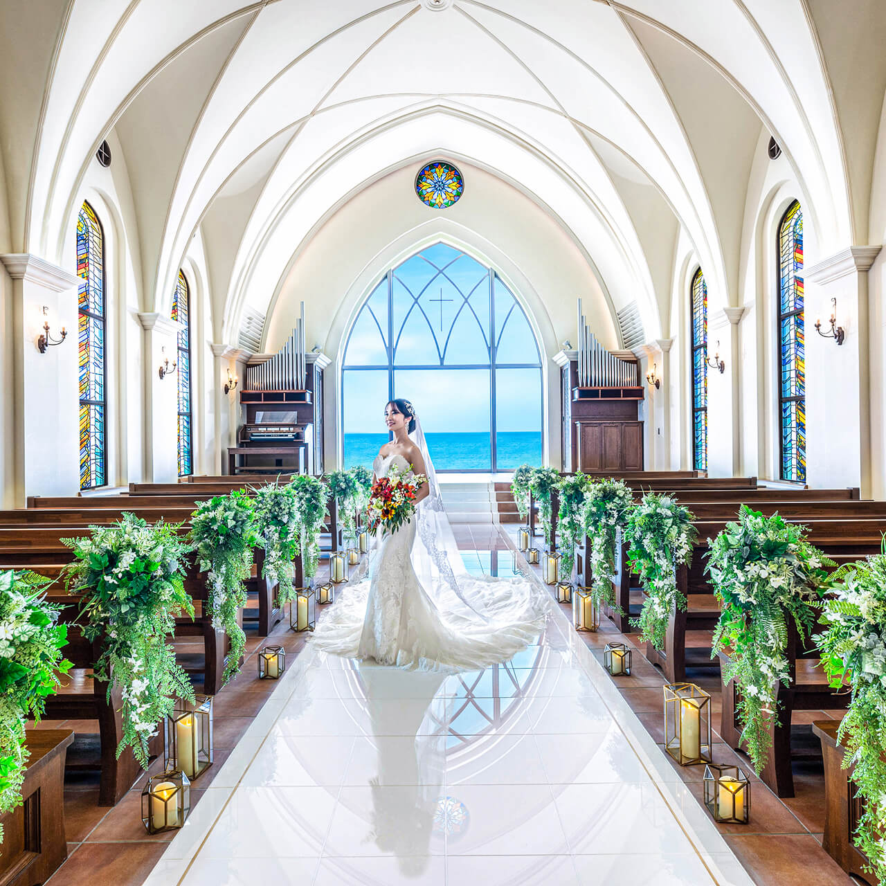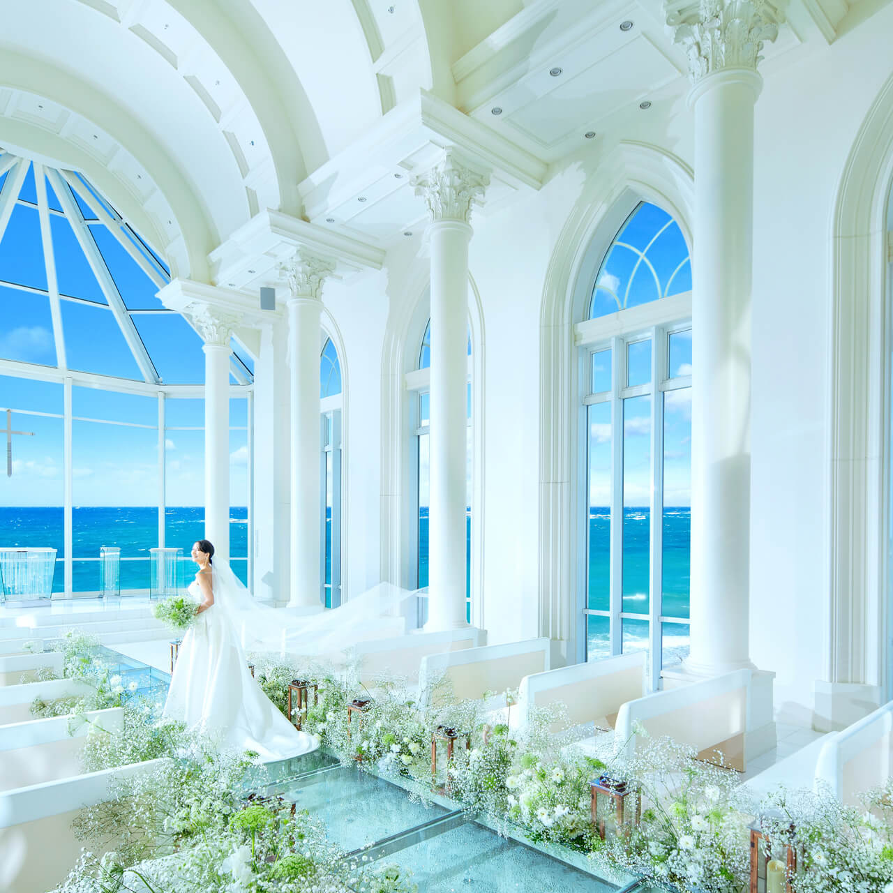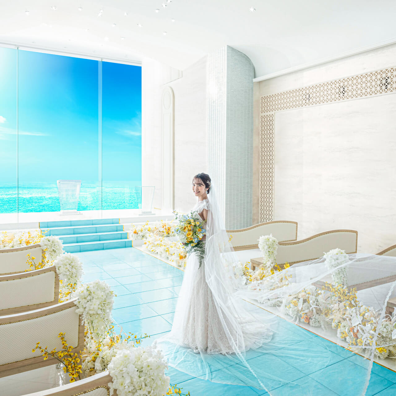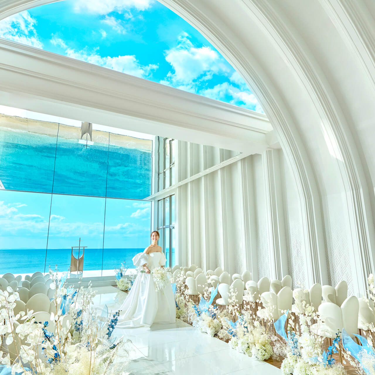 沖縄県内の結婚式場内でも、圧倒的に海に近い距離にある迫力のあるチャペルで挙式を
