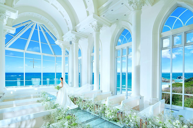 ガラスの祭壇の先に海と空が広がっており、白と青の美しい世界の中でウェディングが叶います。