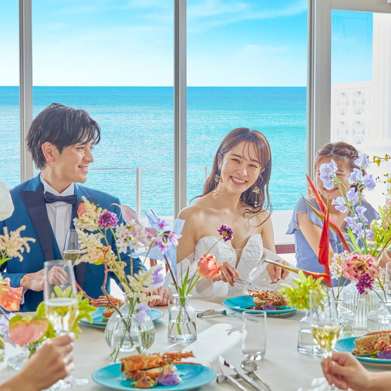 透明度⾼い海が⽬の前に上質で⾼級感あるチャペル。