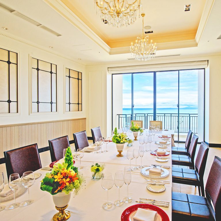 ⽔平線に広がる海を⾒渡せる最上級のチャペル。