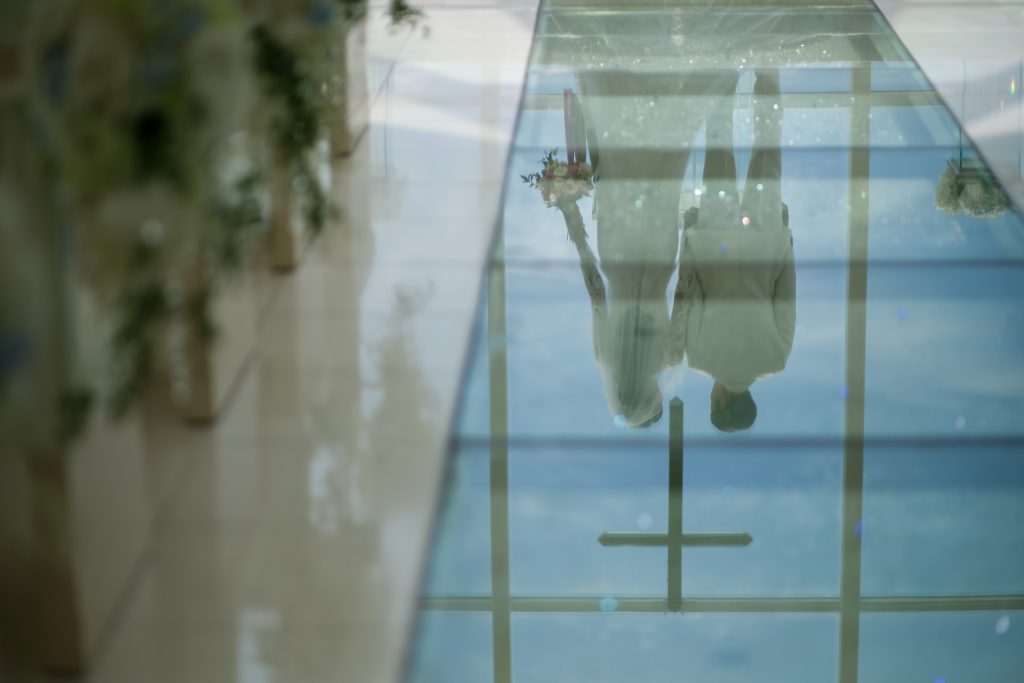 バージンロードに反射したお二人の後ろ姿