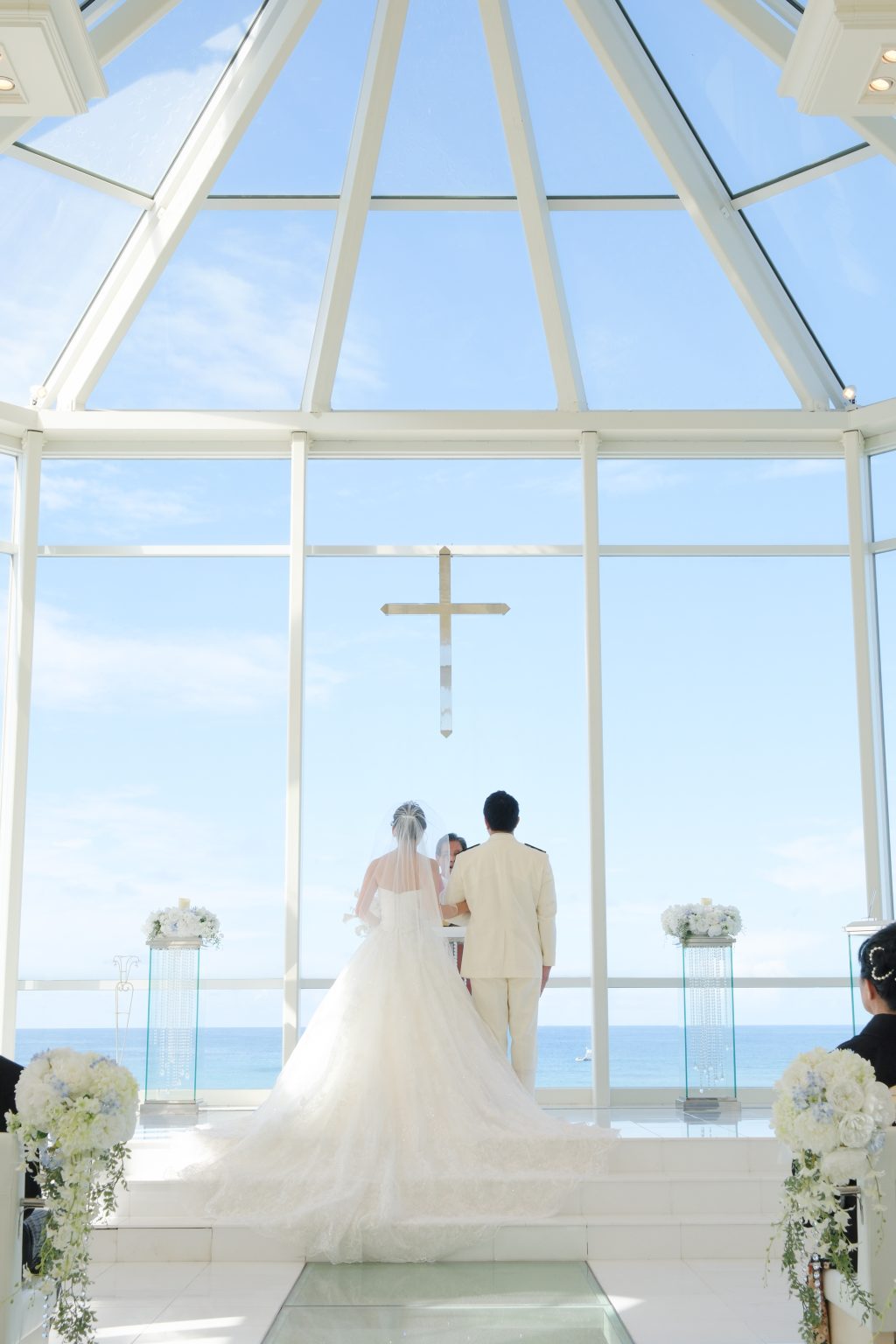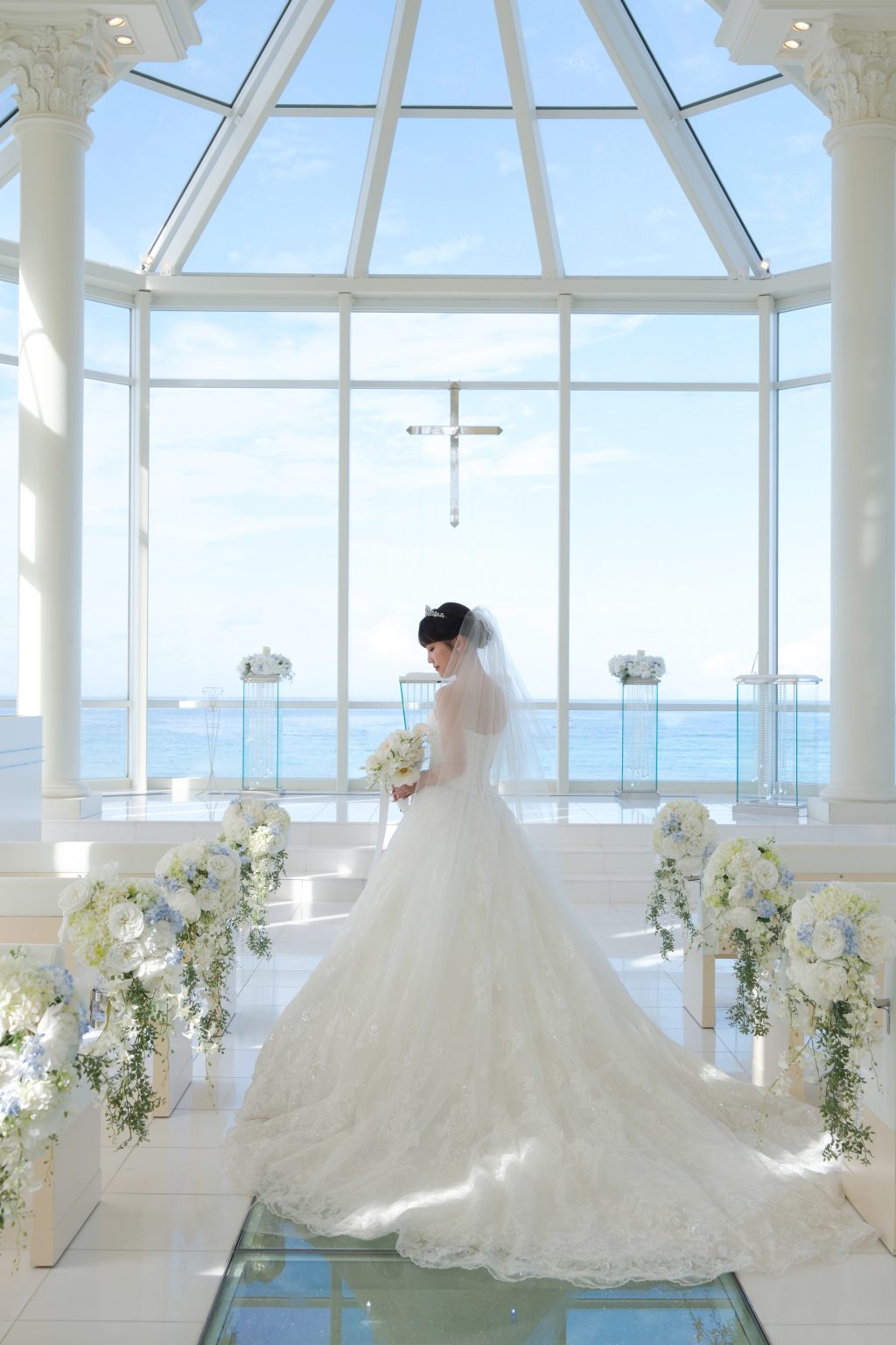 沖縄のキレイな海と空が一望でき、真っ白な教会の内装とガラスのバージンロードが