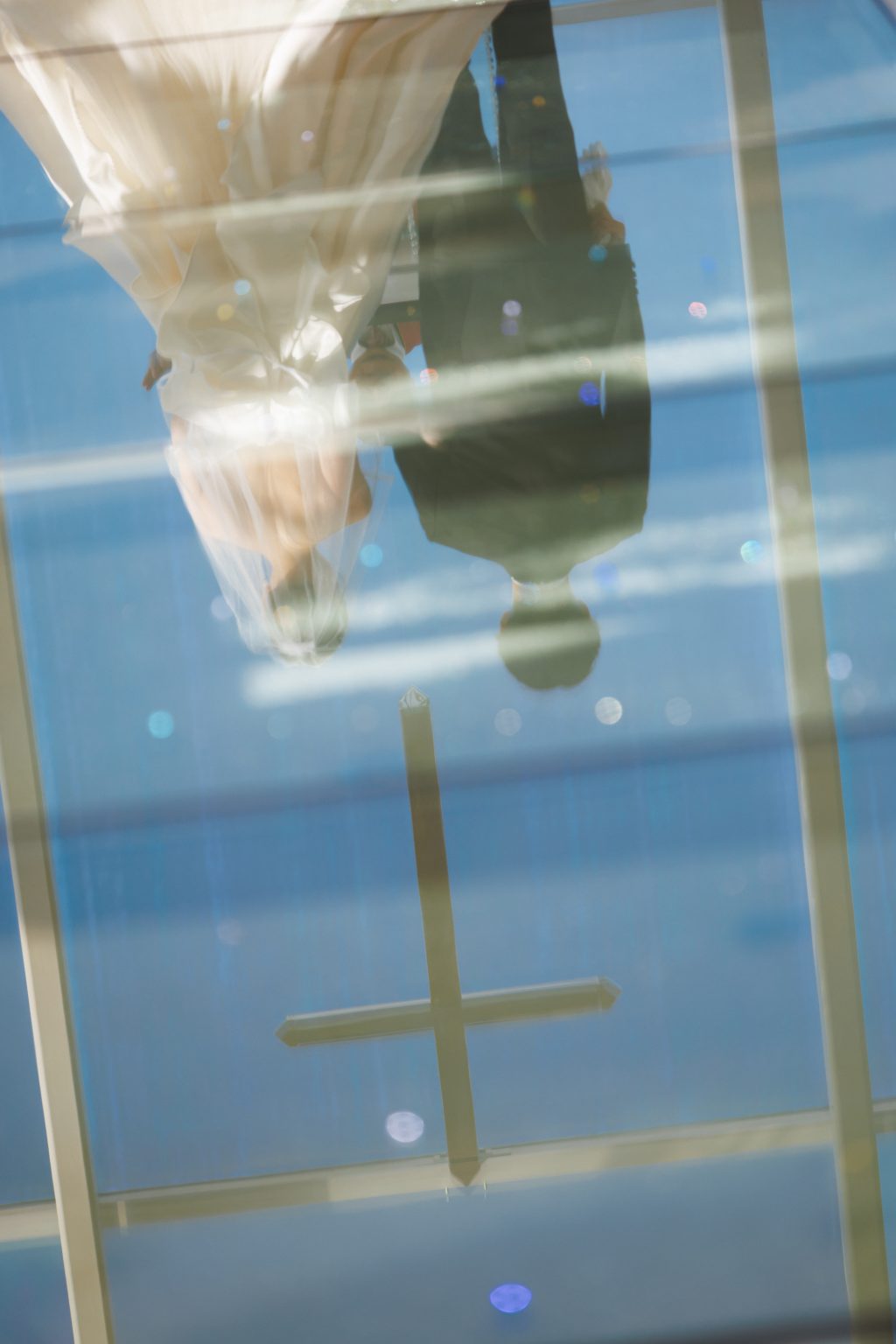 バージンロードに反射した、お二人の後ろ姿に