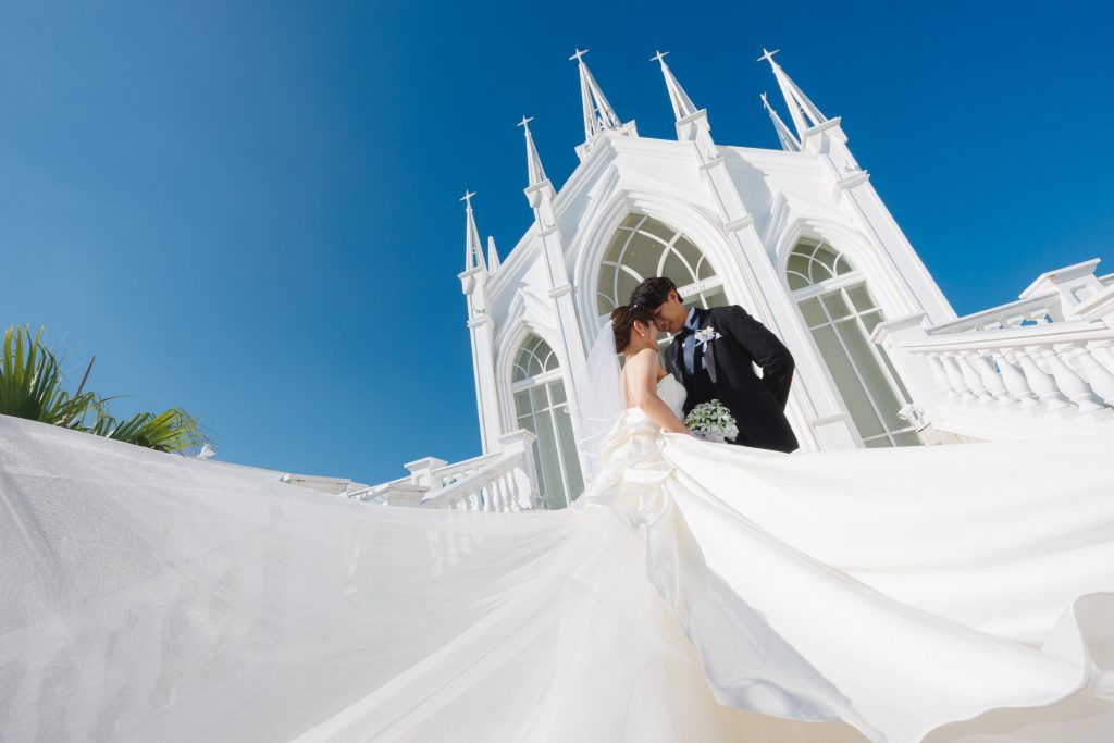 ドレスの長いトレーンを生かした、