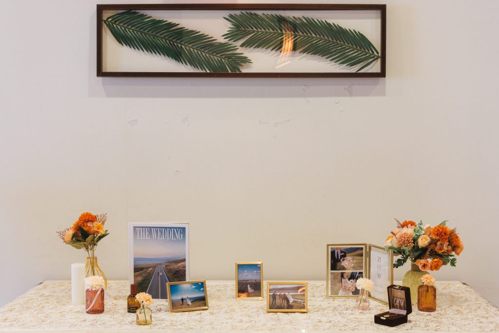 お二人で行った、思い出の場所の写真を飾り